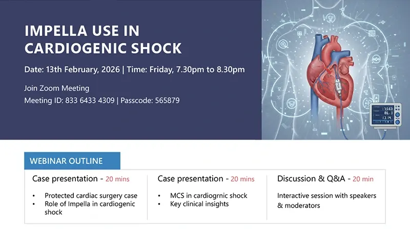 This expert-led webinar explores the evolving role of Impella support in cardiogenic shock, highlighting its application in cardiac surgery and acute myocardial infarction (MI). The session focuses on patient selection, timing of mechanical circulatory support, clinical decision-making, and real-world outcomes in advanced heart failure and shock management.